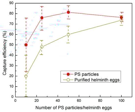 | Mean Number of Spiked Polystyrene Particles | Mean Number of Particles in FOV (±SD) | Capture Efficiency (%) |