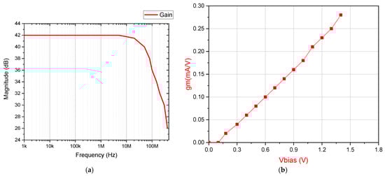 - High-Frequency Performance: The proposed emulator achieves a high operating frequency of 100 MHz, matching the highest performance reported in the literature [32], while offering significant architectural improvements. Unlike the reference design requiring 15 MOS transistors and a differential voltage current conveyor (DVCC) with three additional MOS devices, our implementation attains this high-frequency operation with greater efficiency, utilizing only 13 transistors in total and a simpler configuration based on a single OTA with just two MOS components.