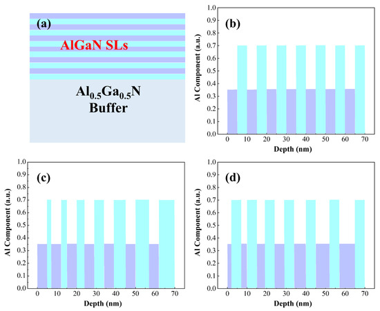- Liu, Y.; Yang, X.; Zhou, X.; Li, P.; Yang, B.; Zhao, Z.; Xiang, Y.; Bai, J. Design and Growth of P-Type AlGaN Graded Composition Superlattice. Micromachines 2024, 15, 1420. [Google Scholar] [CrossRef] [PubMed]