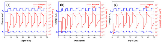 Notably, all samples shared identical well/barrier compositions, with only variations in well/barrier thicknesses, yet the hole density varied by over 14%. The underlying reason is that the acceptor energy levels in the barrier layers are spatially closer to the valence band maximum (VBM) of the quantum well layers, making it easier to capture electrons from the VBM of the quantum wells and leave holes behind. Thus, acceptors doped in the barrier layers tend to be activated within the quantum well regions. Due to the band bending induced by polarization effects, recombination-generated holes are prone to accumulate at the well-barrier interfaces, forming a quasi-two-dimensional hole gas (quasi-2DHG). When the barrier layer thickness is fixed and only the well layer thickness is varied, the total number of ionized acceptors in each barrier region remains nearly constant, resulting in minimal changes in the average hole concentration. Conversely, reducing the barrier layer thickness decreases the number of acceptors incorporated in this region, leading to fewer ionized acceptors (as shown by the hole concentrations in the first two well-barrier layers of Figure 2a,b). Consequently, the overall hole concentration of the superlattice structure decreases under such conditions, necessitating an increase in the barrier layer doping concentration to achieve higher hole concentrations.