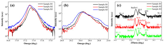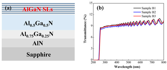 To validate the simulation design, experimental growth of three superlattice structures was conducted corresponding to the three simulated configurations. Considering the challenges in growing and characterizing graded-width superlattices, the experiments were simplified. Specifically, Structure B1 features both well and barrier layers with a width of 5 nm. Structure B2 has a fixed well width of 5 nm and a barrier width of 2 nm. Structure B3 has a fixed well width of 2 nm and a barrier width of 5 nm. All samples were grown on 2-inch c-plane sapphire substrates using a metal-organic chemical vapor deposition (MOCVD) system (AIXTRON CRIUS 2, Herzogenrath, Germany). Trimethylaluminum (TMAl) and trimethylgallium (TMGa) were employed as metal sources, ammonia (NH3) as the nitrogen source, hydrogen (H2) as the carrier gas, and bis(cyclopentadienyl)magnesium (Cp2Mg) as the Mg dopant. As shown in Figure 3a, the buffer layer stack (from bottom to top) consists of AlN, AlxGa1−xN, Al0.5Ga0.5N, and the superlattice structure. The average Al composition of the superlattice structure was 0.53, consistent with the well/barrier width parameters in Figure 1. The detailed growth procedures are as follows: (1) Pre-epitaxy cleaning of the sapphire substrate via heating to remove surface contaminants. (2) Surface nitridation and growth of a low-temperature AlN nucleation layer. (3) Growth of a 500-nm-thick high-temperature AlN layer. (4) Gradual adjustment of the Al composition to 0.75, followed by growth of ~500 nm Al0.75Ga0.25N. (5) Growth of a ~1 μm thick Al0.5GaN buffer layer. (6) Growth of the superlattice, where the period thickness was controlled by growth time. Mg doping was exclusively introduced during barrier layer growth with a Mg flow rate of 320 sccm, resulting in a 7-period superlattice. (7) Post-growth annealing of the samples in a N2 atmosphere.
