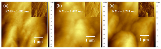 Figure 5a–c present the AFM surface morphology images of the three sample groups. The insets in Figure 5 show shaded-processed AFM height maps, which clearly reveal the surface steps. All three samples exhibit distinct step features on their surfaces. Notably, the roughness of Samples B1 and B2 is lower than that of Sample B3. This discrepancy arises from the superlattice well-barrier structure; the surfaces of the samples correspond to a low-Al-composition AlGaN layer. Specifically, Samples B1 and B2 have a 5-nm-thick low-Al-composition AlGaN layer on their surfaces, whereas Sample B3 only has a 2-nm-thick layer. When the Al composition is low, the material grows in a 2D step-flow mode. As the Al composition increases, fewer atoms can reach the step edges, leading to a rougher surface and a higher RMS (root mean square) roughness. Although Sample B2 shares the same surface AlGaN layer thickness as Sample B1, its more varied periodic structure prior to surface growth results in a relatively poor surface morphology.