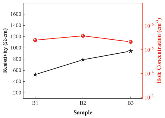 Hall measurements were performed on the three sample groups, and the test results are shown in Figure 6. Sample B3 exhibits the poorest hole concentration and resistivity, which is attributed to the use of a graded well layer thickness in Sample B3. In the superlattice structure, the acceptors in the barrier layer are activated by capturing free electrons from the valence band maximum of the well layer, thereby reducing the acceptor activation energy. The thin well layer thickness in B3 reduces the number of activated acceptors, leading to low hole concentration and high resistivity. In contrast, Sample B2 has a higher hole concentration than Sample B1 but a lower resistivity than Sample B1. The reason is that Sample B2 maintains a fixed well layer thickness and employs a graded barrier layer thickness. Although this configuration contributes to increasing the hole concentration, the presence of thick barrier layers makes it difficult for holes to tunnel through and subjects them to greater scattering, thereby increasing resistivity.