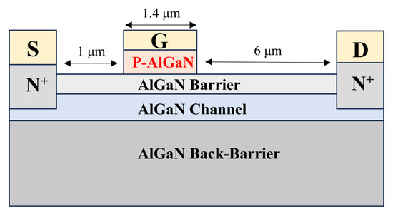 In the device structure shown in Figure 7, the gate-source spacing is 1 μm, the gate-drain spacing is 6 μm, and the gate length is 1.4 μm. All structures have a p-type layer thickness of 60 nm, with the p-type layers being p-(Al)GaN and p-AlGaN superlattice, respectively. For simplicity, the enhancement-mode HEMT using p-(Al)GaN as the material under the gate will be referred to as the “conventional structure device,” and the one using p-AlGaN superlattice under the gate will be referred to as the “superlattice structure device” in the following text. When different Al compositions of AlGaN materials are used as the gate-under material in the conventional device structure, and the p-type region doping concentration is uniformly 1 × 1018 cm−3, the electron concentration in the channel region is shown in Figure 8.