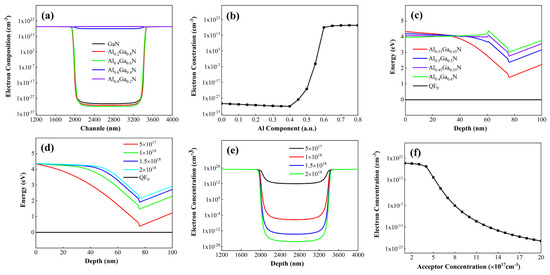 As depicted in Figure 8d, adjusting the doping concentration of the p-AlGaN material changes the band structures of the gate-under material, barrier layer, and channel layer. With increasing doping concentration, the distance between the conduction band and the Fermi level gradually increases, indicating an increase in the threshold voltage. Figure 8e,f show the electron concentration distributions in the channel under different acceptor doping concentrations. The electron concentration under the gate decreases with increasing acceptor doping. Figure 8f shows the electron concentration at the gate-under channel under different acceptor doping concentrations. As the acceptor doping increases, the electron concentration decreases with a gradually reduced slope, indicating that the influence of acceptor doping concentration on the channel approaches its peak.