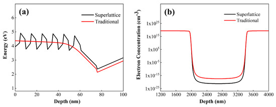 Figure 9a presents the energy band diagrams of the p-type region under the gate, the barrier layer, and the channel layer. The two structures have the same Al composition in the p-type material under the gate, meaning the stress on the barrier layer is consistent, and the effects caused by piezoelectric polarization are consistent. However, when the superlattice is used as the p-type material under the gate, the higher hole concentration compared to the conventional structure leads to an upward shift of the conduction band, resulting in a larger threshold voltage and enhanced gate control capability. Figure 9b shows the electron concentration distribution in the channel region of the superlattice structure device. By using the superlattice structure as the p-type layer under the gate, compared with the conventional structure, the hole concentration is higher under the same doping concentration. More electrons in the channel are depleted, which helps increase the threshold voltage.