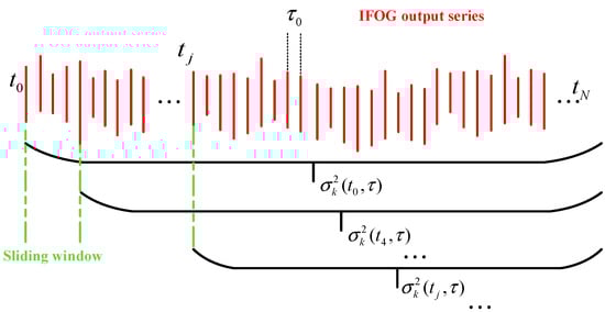 Similarly, as demonstrated in prior work, the dynamic Allan variance principle is actually used to identify the error characteristics of IFOG data within a limited range on both sides at a certain moment through the sliding window. Referring to the idea of dynamic Allan variance, we can introduce the idea of time sliding into the calculation of recursive Allan variance and slide the starting data point of recursive Allan variance. First, starting from the initial time of the FOG’s working cycle, the first set of Allan variances can be recursively calculated based on Formula (9), and then the output corresponding to the FOG at the working time is selected as the starting data point for a period of time, and the same is based on Formula (9) recursively calculates the second set of Allan variances, and so on. Multiple sets of Allan variance curves can be obtained at different moments . The specific calculation process diagram is shown in Figure 1.