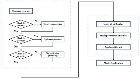 Observing Formula (12), it can be seen that the AR model has the characteristics of discrete superposition of time-related terms and white noise terms, which is consistent with the data characteristics of FOGs. Therefore, this model has become a common model for suppressing random walk errors in FOG angles. The specific modeling process is shown in Figure 2 and is not described here.