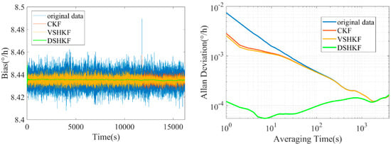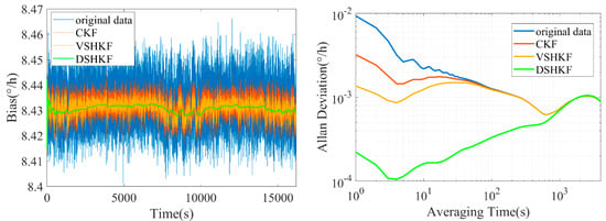 According to the data in Table 2, the DSHKF algorithm suppresses the ARW error of the three IFOGs. For IFOG-A, the ARW coefficient of the filtered data after DSHKF algorithm is reduced by 97.12%, 93.87%, and 92.90% respectively compared with the original data, the filtered data after CKF algorithm, and the filtered data after VSHKF algorithm. For IFOG-B, the ARW coefficient of the filtered data after DSHKF algorithm is reduced by 97.19%, 92.00%, and 85.30% respectively compared with the original data, the filtered data after CKF algorithm, and the filtered data after VSHKF algorithm. For IFOG-C, the ARW coefficient of the filtered data after DSHKF algorithm is reduced by 96.22%, 89.96%, and 85.00% respectively compared with the original data. The CKF algorithm has the worst filtering effect.