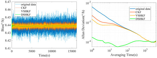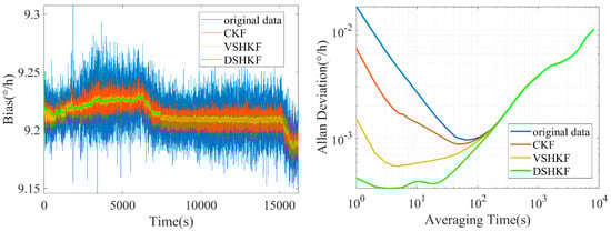 IFOG−B output filtering results and Allan variance curves at room temperature.