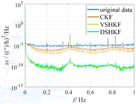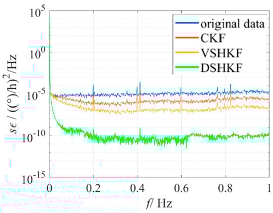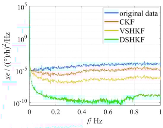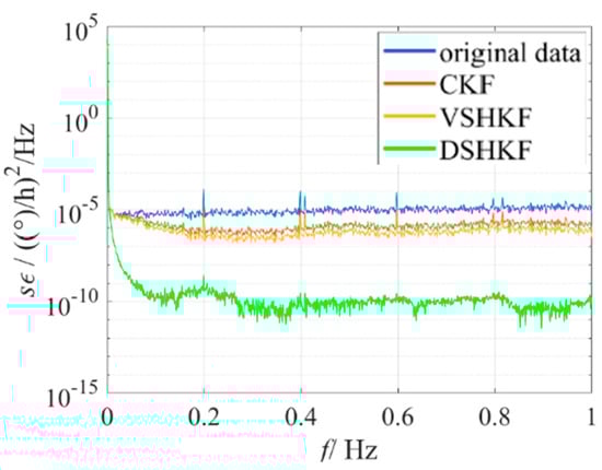 It can be seen from Figure 7, Figure 8, Figure 9 and Figure 10 that the power spectral density distribution of IFOG data filtered by the DSHKF algorithm shows typical colored noise characteristics, and the power spectral density of IFOG data filtered by other algorithms only has some in amplitude. However, the data characteristics of the main component of the angular random walk error (ARW, i.e., angular rate white noise) have not changed significantly. This shows that the DSHKF algorithm can almost completely suppress the main impact of ARW error in IFOG data, while other algorithms cannot achieve this filtering effect.
