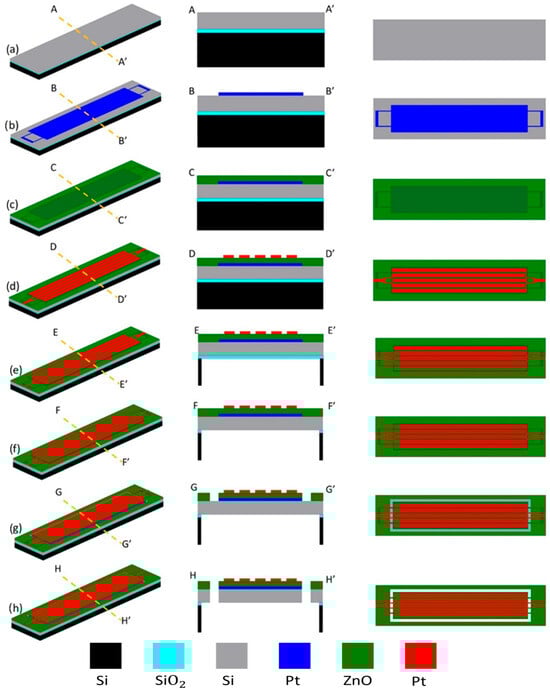 (a–h) Illustration of the fabrication process flow by depicting key steps of the fabrication in perspective, cross-section, and top-view diagrams.