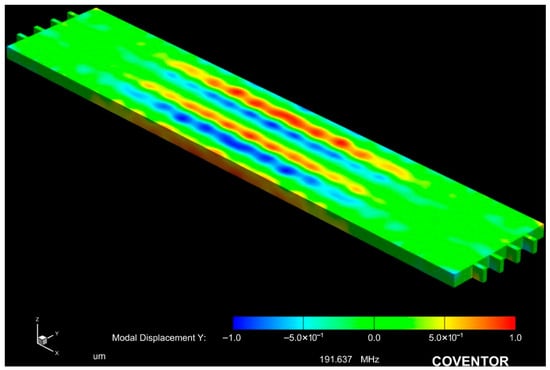 The resonators in this work operate by employing a ZnO piezoelectric transducer to actuate the released resonator body to vibrate in a strategically designed resonance mode. The modal analysis simulation of the resonator body is conducted by exploring the state of the released resonator body at its eigen frequency by applying mechanical forces that correspond to the target mode shape of the resonator body structure at its natural resonance frequency. By subjecting the piezoelectric thin-film layer to an electric field between the top and bottom electrodes, it undergoes deformation, thus resulting in a phenomenon known as the piezoelectric effect. When an AC sinusoidal electric field is applied, and its frequency matches the resonator body’s resonance frequency, the released resonator body is stimulated to vibrate in its corresponding resonance mode. A thin-film piezoelectric-on-silicon (TPoS) resonator typically consists of a thin-film piezoelectric transducer layer sandwiched between two metallic electrodes, which are placed on a low-mechanical-loss resonator body composed of a substrate material such as crystalline silicon. The resonance frequency of ZnO-on-Si resonators is primarily determined by the effective acoustic velocity of the resonator body structure, which comprises a stack of thin-film ZnO piezoelectric layers, top and bottom electrode layers, and a Si structural layer. As a result of the resonator body structural materials, piezoelectric micromechanical lateral-extensional resonators could exhibit Q-factors ranging from moderate (<1000) to high (>10,000), while resonance frequencies range from tens of MHz to a few GHz, depending on the excited mode. The acoustic velocity of single-crystal silicon is significantly greater than that of sputtered ZnO thin film. Applying an AC actuation signal to the piezoelectric thin-film transducer causes the ZnO piezoelectric transducer layer and the underlying silicon device layer to resonate together. For instance, the lateral extensional mode involves the expansion and contraction of the Si resonator body through the converse piezoelectric effect. The resonator body’s deformation causes periodic piezoelectric charges to be generated throughout the resonator body and detected by the output electrodes in a reciprocal manner. Figure 3 depicts the modal vibration of the 5th lateral extensional mode of the device at the resonance frequency of 191.64 MHz, which is designed with five interdigitated (IDT) top electrodes to vibrate at its 5th-order mode.