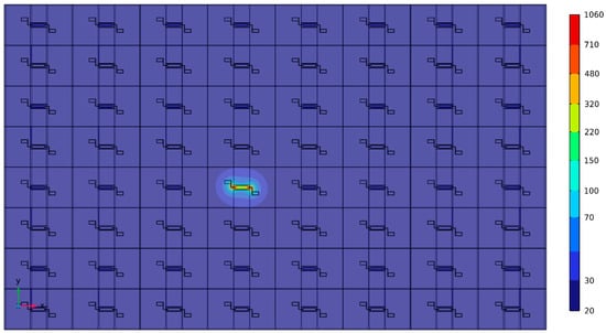 COMSOL Multiphysics thermal simulation of an array of identical rectangular-plate ZnO-on-Si resonator devices under localized Joule heating. The simulation shows that the temperature elevation—indicated by the color bar (in °C)—is confined to the annealed resonator, while adjacent devices remain at significantly lower temperatures. This demonstrates that localized annealing by resistive Joule heating effectively limits the thermal impact on neighboring structures, a result not achievable by conventional annealing methods such as furnace, oven, or hot-plate treatments.