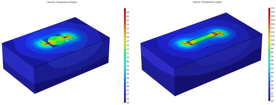 COMSOL Multiphysics thermal simulation of a disk-shaped and a rectangular-plate resonator, both with side-supporting anchors, through localized annealing under conditions identical to those applied during the experimental study conducted in this work.