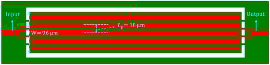where is the width of the suspended rectangular-plate resonator body, is the equivalent Young’s modulus of the stacked and suspended resonator body, N is the number of the interdigitated (IDT) electrode fingers, and is the pitch size. The dimensions and layout of the rectangular-plate resonator are clearly depicted in its top-view diagram, as shown in Figure 7, illustrating its configuration. Figure 8 shows a top-view schematic of the disk resonator, depicting its key dimensions and geometric arrangement. R is the radius of the disk resonator, and is the mode-dependent frequency constant. The resonator can be modeled as simple as a series RLC (Rm, Lm, Cm) circuit, where Rm, Lm, and Cm represent the motional resistance, motional inductance, and motional capacitance, respectively. The motional resistance of a rectangular-plate resonator operating in its fundamental mode can be expressed as [26,28]: