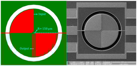 Top-view schematic and SEM photo of a 150 μm radius disk resonator to show its key dimensions and the layout of its two-port input and output electrode configurations.