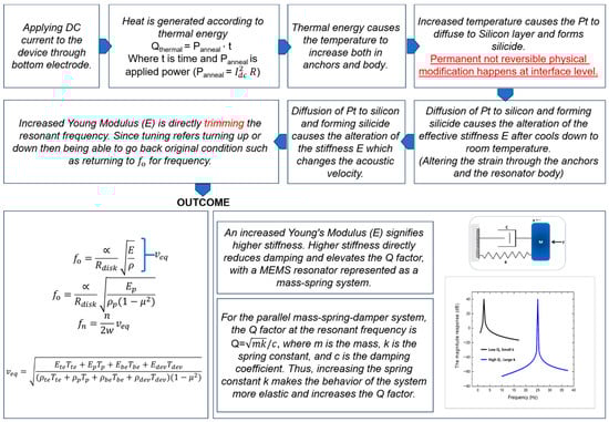 where is the transverse piezoelectric coefficient, is the Young’s modulus of the ZnO layer, and Q is the quality factor of the resonator. Figure 9 presents a conceptual diagram that correlates localized annealing by Joule heating with induced changes in the material properties of the structural materials of the resonator body and anchors [29]. As a result, the Young’s modulus of both the resonator body and its side-supporting anchor is increased after localized annealing that leads to a slight resonance frequency increase and greatly increased energy stored per cycle, along with reduced anchor-related losses through those annealed side-supporting anchors. As shown in Figure 5, the side-supporting anchors could reach a temperature as high as 1060 °C, as the highest temperature of the entire resonator body for localized annealing by Joule heating.
