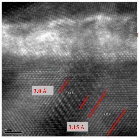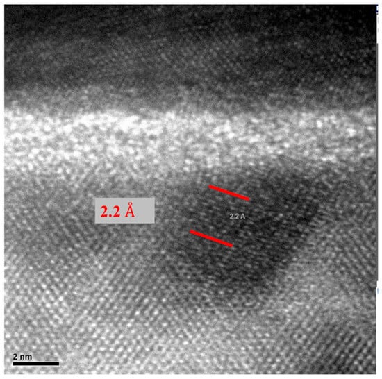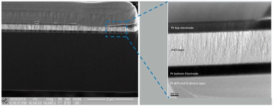The annealing process is initiated by the precise application of a direct current (DC), which selectively heats the resonator body through predetermined side-supporting anchors. This localized Joule heating approach is critical, as it ensures the platinum diffusion occurs only at specific regions within the resonator body and anchors, thus maintaining the integrity and functionality of the annealed resonator device while not thermally impacting any of the adjacent devices situated on the same wafer substrate. The temperature is carefully ramped to specific thresholds to control the formation of different platinum silicide phases, each of which could impact the resonator’s properties differently. At the onset, around 180 °C, the first phase of platinum silicide, Pt2Si, begins to form. This Pt2Si phase is crucial, as it lays the foundational microstructure for further silicide development. As the annealing process continues and the temperature reaches approximately 260 °C, this phase transitions predominantly into Pt2Si. This phase is known for its potential to enhance the structural stability and uniformity of the silicide layer, which is beneficial for the mechanical properties of the resonator. The process is not complete until the temperature escalates to 360 °C, at which temperature the PtSi phase starts to form [31]. A cross-sectional sample was prepared by milling the device using a Quanta 200 3D Dual Beam Focused Ion Beam (FIB) system (Field Electron and Ion Company, Hillsboro, OR, USA). The sample was thinned down to approximately 100 nm to enable high-resolution TEM imaging and interface analysis, as shown in Figure 14. This final phase is noted for its superior mechanical properties, which are essential for achieving enhancements in Young’s modulus and overall performance.