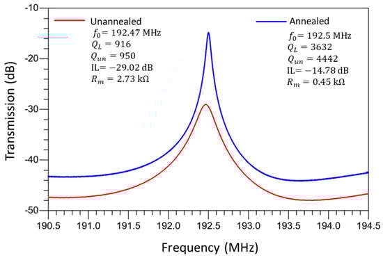 A comparison of measured frequency responses of a disk-shaped ZnO-on-Si piezoelectric resonator before and after localized annealing.