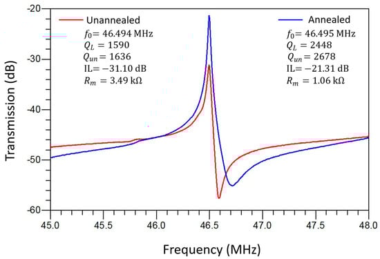 The electrical characterization of the MEMS resonators was performed using a Keysight E5061B Vector Network Analyzer (VNA) (Keysight Technologies, Santa Rosa, CA, USA) connected through Cascade Microtech GSG RF probes on a probe station. All RF probe measurements were conducted in ambient air at room temperature. The full S-parameter frequency responses of the resonators were measured, and key parameters such as the resonance frequency, motional resistance, and Q-factor were extracted using modified Butterworth–Van Dyke (mBVD) equivalent circuit fitting. Figure 12 shows the measured frequency responses for a rectangular-plate resonator, showcasing improvements in key performance metrics such as the Q-factor and motional resistance after the localized annealing process. Figure 13 shows the measured frequency responses of a disk resonator, which also demonstrates the enhancements in performance after the localized annealing treatment. Localized annealing enables the designer to anneal the device selectively in case frequency trimming is needed while also offering an effective means to enhance the overall resonator performance further.
