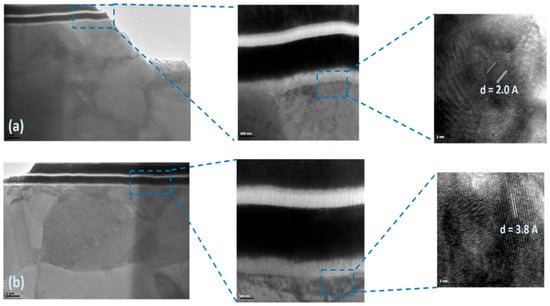 TEM images for a FIB-prepared cross-sectional specimen from a rectangular-plate resonator by showing resonator layer interfaces: (a) before annealing and (b) after annealing.