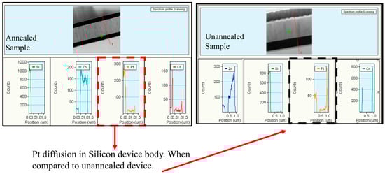 A comparison of Energy Dispersive Spectroscopy (EDS) analysis results from annealed and unannealed TEM samples, which clearly show that the localized annealed sample has a substantial amount of Pt diffused into the SOI’s Si device layer away from the original Pt/Si interface.
