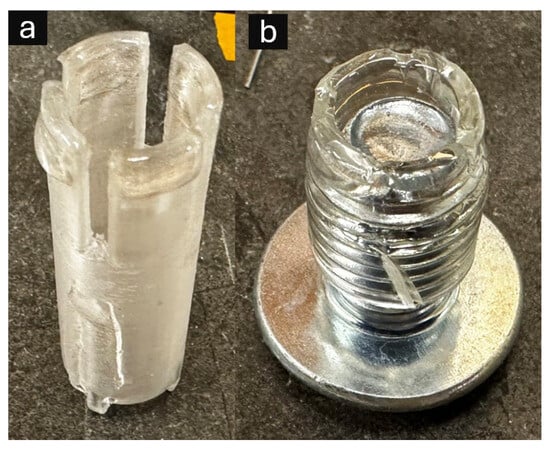 Alternative manual stamping devices for resin frame fabrication: (a) 3D printed cyclic olefin co-polymer (COC) stamping tool featuring precisely engineered circular geometry with integrated air release channels to prevent bubble formation during resin transfer; (b) laboratory-grade polyvinyl chloride (PVC) tubing (1/2″ outer diameter, 3/8″ inner diameter) with inserted bolt to maintain consistent circular configuration and triangular cutouts for air displacement control.