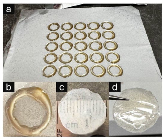 Three-dimensional printed UV-curable resin support structures integrated with electrospun nanofiber membranes (ESNFMs). (a) Five-by-five array of circular frames directly printed onto ESNFM substrate, demonstrating scalable fabrication and consistent frame–membrane integration; (b) close-up of resin ring on ESNFM; (c) nanofiber/resin composite disk oriented with ESNFM surface exposed (nanofiber side up), revealing embedded fibrous texture within resin matrix; (d) composite disk oriented with pure resin surface exposed (ESNFM side down), showing smooth polymer interface for comparative biocompatibility assessment.