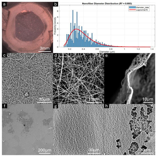 Characterization of framed electrospun nanofiber membranes (ESNFMs). (a) Optical microscopy image showing overall frame–membrane integration; (b) Nanofiber diameter distribution histogram with fitted lognormal curve (mean = 381 nm, mode = 295 nm, R2 = 0.693); (c,d) high-magnification SEM images revealing characteristic nanofiber mat architecture and porosity; (e) cross-sectional view of ESNFM edge demonstrating mat thickness <5 μm; (f–h) SEM analysis of ESNFM underside at the resin–nanofiber interface. Resin penetration was heterogeneous, with incomplete saturation observed in regions (f,h), while areas of successful resin integration retained characteristic nanofiber surface texture imparted by the underlying fibrous architecture (g).