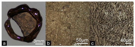 ESNFMs were soaked in an aqueous CuSO4 solution (approximately 0.5 M, certified ACS, Thermo ScientificChemical, Waltham, MA, USA) at 40 °C for 10 min. This process resulted in a blue coloration on the ESNFMs, indicating that the fibers had absorbed the cupric ion from solution. The absorbed cupric ion was then reduced by immersion of the samples into 3 g/L NaBH4 (99%, Acros Organics, Thermo Scientific Chemicals, Waltham, MA, USA) at 40 °C for 5 min [40]. Occasional flipping of samples in the reducing chemistry was required to release gas bubbles which accumulated on the samples due to the generation of hydrogen gas in the redox reaction. This process resulted in a brown coloration of the samples, indicating a reduction in the absorbed copper. Samples were then soaked in DI water for approximately 5 min to remove any additional NaBH4.