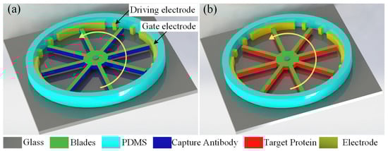 This work designed a microfluidic motor actuated by a reconfigurable ICEO whirling flow and the schematic diagram of the microfluidic motors is presented in Figure 1a. The microfluidic motors mainly consist of a circular chamber, a blade, and electrodes. The electrodes are distributed on the inner wall of the circle chamber. The blade is assembled on the stator, which is located in the middle of the circle chamber. We can fabricate the mold of the circle chamber, pour PDMS, and conduct a curing treatment to obtain the circle chamber of the micromotor. The electrode structure can be prepared with liquid metal. Liquid metal is poured in the mold of the designed electrodes at a temperature above the melting point and solidified at temperatures below the melting point to obtain the electrodes. The blade can be fabricated with two-photon 3D printing technology. Optical tweezers can be used to assemble the electrodes and blades in the circular chamber. Based on the above design and fabrication, we can obtain microfluidic motors for the detection of proteins.