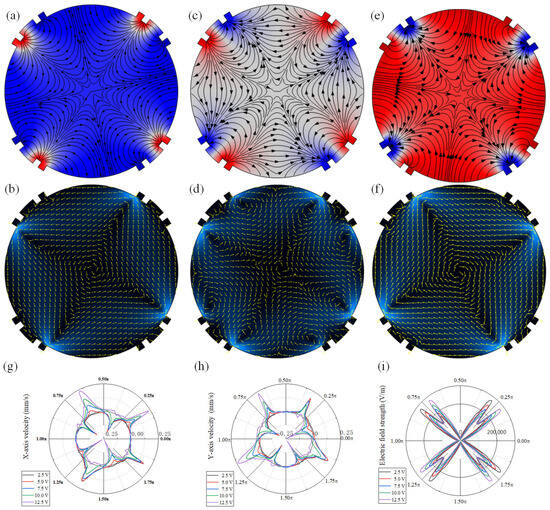 Modulation effect of fixed potential on the flow field. (a–f) Distribution of electric and flow field under different voltage parameters: (a,b) A1 = 15 V, A2 = 7.5 V, and f = 200 Hz; (c,d) A1 = 15 V, A2 = 3 V, and f = 200 Hz; and (e,f) A1 = 15 V, A2 = 13 V, and f = 200 Hz. (g,h) Effect of fixed potential on the ux/uy. (i) Influence of fixed potential on the electric field strength.