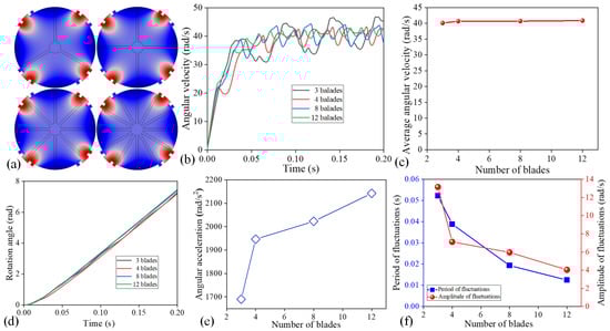 The effect of blade number on the performance of microfluidic motors. (a) Simulation model of microfluidic motors with different blade numbers. (b) Angular velocity of microfluidic motors with different blades versus time. (c) Influence of blade number on the angular acceleration in the startup stage. (d) Rotation angle of microfluidic motors with various blades. (e) The influence of blade numbers on the angular acceleration. (f) The fluctuation period and amplitude of microfluidic motors with blades of various numbers.
