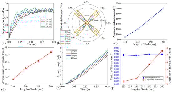 We then studied the effect of the blade length on the rotation of the microfluidic motors. The angular velocities of the eight-blade microfluidic motors with diverse blade lengths are shown in Figure 4a. Microfluidic motors with different blade lengths can be actuated rapidly and then reach a dynamic stable state with diverse rotation angular velocities. The angular velocities of the microfluidic motors exhibited distinct growth trends and fluctuations caused by the decreasing flow rate of the whirling flow radially inward. The electric field strength presented a downward trend with the decreasing diameter of the circles (Figure 4b). Microfluidic motors with long blades experienced a strong driving force of the ICEO whirling flow and obtained a high stable rotation speed. The relationship between the angular acceleration and the blade length in the startup stage is presented in Figure 4c. The average accelerations of the microfluidic motors were increased from 909.38 to 2022.60 rad/s2 at t = 0.02 s with increasing the blade length from 230 μm to 260 μm. The angular acceleration showed an upward trend with the increasing length of the blade because long blades can provide sufficient actuation force in the startup stage. Moreover, the average angular velocity at the stable rotation exhibited an upward trend from 38.84 to 40.68 rad/s with the increase in the blade length from 230 to 260 μm (Figure 4d). Microfluidic motors with long blades needed less time to reach stable rotation with a high rotation velocity. By increasing the blade lengths from 230 to 260 μm, the rotation angle within 2 s was increased from to 6.325 to 7.397 rad (Figure 4e). The fluctuation period remained around 0.019 s with the increasing blade length (Figure 4f). The fluctuation amplitude showed an evident increasing trend from 3.39 to 7.61 rad/s with the increase in the blade length from 230 to 260 μm (Figure 4f). Therefore, long blades can enhance the angular acceleration and stable angular velocity at the startup stage, but they cause a fluctuation of microfluidic motors.
