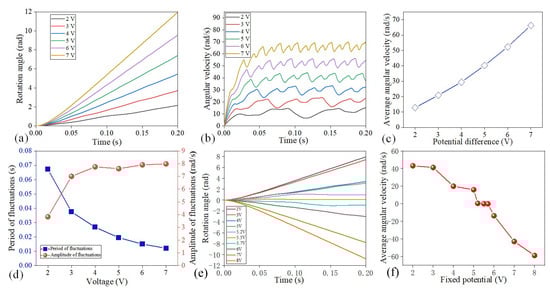 The distribution of the electric field plays a critical role in the rotation of microfluidic motors. For this, we first studied the effect of the voltage drop between the driving electrodes on the rotation performance of microfluidic motors under the fixed potential of 3 V on the gate electrode. The rotation angle of the microfluidic motors under the potential drop of 2~7 V are presented in Figure 5a. Although the rotation angle presented a similar increasing trend under different voltages over time, the microfluidic motors rotated faster under a high potential drop. At t = 0.2 s, by increasing the potential drop from 2 to 7 V, the rotation angle of the microfluidic motors presented a rising trend from 2.17 to 11.96 rad. The angular velocity of the microfluidic motors over time under various potential drops is shown in Figure 5b. The angular velocity increased rapidly at the beginning and then exhibited different growth trends and fluctuations under different potential drops. With increasing the potential drop from 2 to 7 V, the average angular velocity exhibited an increasing trend from 12.84 to 66.28 rad/s (Figure 5c). The fluctuation periods were reduced from 0.067 to 0.012 s, when the potential drop was increased from 2 to 7 V (Figure 5d). The fluctuation amplitude initially exhibited an upward trend with the rising potential drop from 2 to 4 V, and then the amplitude tended to stabilize with the voltage exceeding 4 V (Figure 5d). Next, we studied the effect of the fixed potential on the rotation of the microfluidic motors (Figure 5e,f). At the potential drops of 5 V, the angular velocities decreased from 43.14 to −58.87 rad/s when the fixed potentials on the gate electrode were raised from 2 to 8 V. Noticeably, the rotation direction of the microfluidic motors was switched at the fixed potential of 5.5 V (Figure 5f). Therefore, we can tune the rotation performance of microfluidic motors by adjusting the potential drops between the driving electrodes and fixed potential on the gate electrodes.