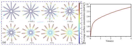 In this section, we numerically demonstrated the feasibility of microfluidic motors in the detection of proteins. The distribution of adsorbed proteins on the blade surfaces of microfluidic motors at different times is given in Figure 6a. There were no adsorbed proteins on the microfluidic blade surface at t = 0 s. As the proteins diffused in the detection chamber, the blade tips first contacted and adsorbed proteins at t = 0.05 s. At t = 0.15 s, many proteins were adsorbed on the tips of the blades. Afterwards, the multilayer of proteins was adsorbed on the blade surface of the microfluidic motors for an enhanced coloring gradient (t = 0.8~4 s). As the proteins steadily diffused, the absorbed proteins on the blade surfaces continued to increase. The average surface concentration of the adsorbed proteins on the blades over time is given in Figure 6b. At t = 0~0.3 s, the average surface concentration presented a linear rise for rapid adsorption on available active sites. At t = 0.3~0.6 s, the average surface concentration began to slow down and entered the deceleration stage due to site occupancy and steric hindrance.