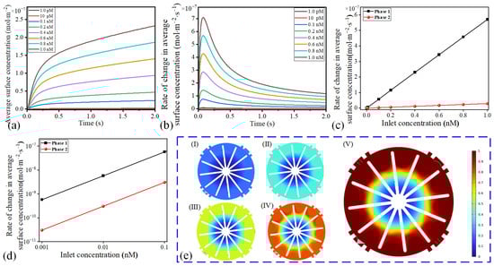 The effect of different inlet concentrations on the detection of proteins. (a,b) Average surface concentration and its change rate under different input concentrations. (c,d) The change rate of surface concentration in the start-up stage and the stable change stage at different input concentrations. (e) The concentration distributions under different conditions at t = 1 s, corresponding to input concentrations of 0.2, 0.4, 0.6, 0.8, and 1 nM in I–V, respectively.