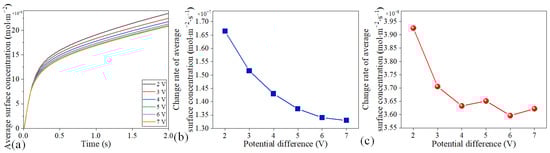 We also studied the modulation effect of the potential drop on the detection of proteins by numerical simulations. The surface concentration over time under different potential drops is presented in Figure 8a. At t = 2 s, with increasing the potential drop from 2 to 7 V, the average surface concentrations on the blades were reduced from 2.3465 × 10−7 to 2.0854 × 10−7 mol/m2. As the potential drop increased, the growth rate of the surface concentration showed a downward trend at t > 0.08 s. The change rate of the surface concentration experienced a slight drop when the potential drop was increased from 5 V to 7 V because the reaction rate had slowed down, as shown in Figure 8b. After t = 1.8 s, the change rate of the average surface concentration was reduced from 3.9255 × 10−8 to 3.6223 × 10−8 mol/m2·s with the increase in the voltage from 2 to 7 V, as shown in Figure 8c. When the voltage was increased from 2 to 4 V, the surface concentration change rate gradually decreased. When the voltage was further increased to 6 V, the change rate reached the lowest value and then tended to be stable. Therefore, we can adjust the detection performance of microfluidic motors by changing the potential difference between the driving electrodes.