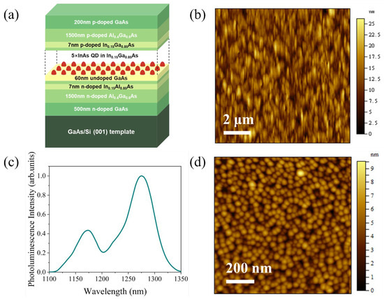 (a) Schematic of the layer structure. (b) AFM image (10 μm × 10 μm) of 1000 nm GaAs buffers grown on on-axis Si (001) substrate with a root mean square roughness of 3.27 nm. (c) Room-temperature photoluminescence spectrum of the QD active region grown on the Si substrate. (d) AFM image (1 μm × 1 μm) of QDs with a density of 5.2 × 1010/cm2.