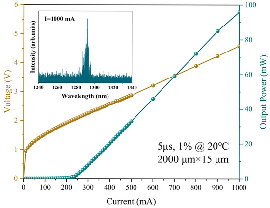 P-I–V characteristics for a 15 μm × 2 mm edge-emitting QD laser grown on a GaAs/Si (001) template under pulsed conditions at room temperature. The inset shows the lasing spectrum of the laser at an injection current of 1000 mA.