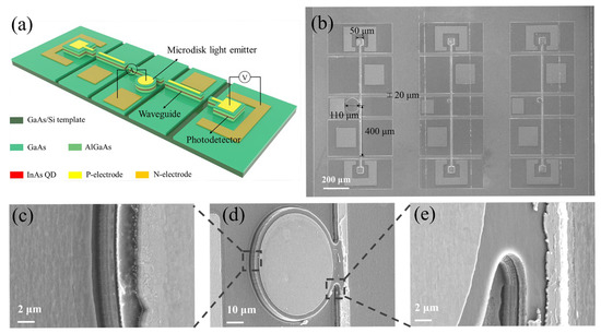 Subsequently, the same wafer was processed by standard photolithography and inductively coupled plasma (ICP) etching to define the microdisk light emitter and photodetector structures. Firstly, Ti/Pt/Au (50/50/300 nm) films were evaporated by electron beam evaporation as the p-type metal electrodes. Subsequently, microdisk light emitters coupled with a 10 μm wide waveguide and photodetectors were defined using ICP etching down to the n-contact GaAs layer. Next, to prevent current from flowing between different devices, an additional deep etching was performed using ICP until reaching the undoped layer of the GaAs/Si template, thereby creating insulating channels between the waveguide and the active devices. Afterwards, AuGe/Ni/Au (50/25/300 nm) films were evaporated by electron beam evaporation as the n-type metal electrodes. No sidewall coating or passivation was applied. Figure 3a presents the schematic diagram of the silicon-based optoelectronic integrated system. The scanning electron microscope (SEM) image of the silicon-based optoelectronic integrated system is shown in Figure 3b. A typical microdisk light emitter has a diameter of 110 μm, and the total length of the waveguide is approximately 400 μm. The photodetector is designed with a side length of 50 μm. The insulating channel width between the devices is 20 μm. Figure 3c–e present locally magnified images of the microdisk light emitter sidewall and the tangent region between the microdisk light emitter and the waveguide, illustrating the slope and surface roughness that can influence optical losses.