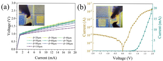 The current–voltage (I–V) characteristics of microdisk light emitter with different diameters measured at 15 °C under continuous-wave (CW) operation are shown in Figure 4a. As the diameter of the microdisk light emitters increases from 20 μm to 110 μm, the corresponding differential resistance decreases from 43 Ω to 23 Ω. Figure 4b illustrates the I–V curves of the photodetector in both linear and logarithmic scales under dark conditions. At zero-bias voltage, the dark current is 0.4 μA and the resistance is 62 Ω. The rectification ratio of the photodetector is approximately 1465 within the voltage range of ±2 V.