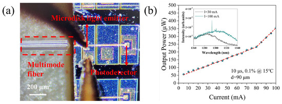 After measuring the I–V characteristics, we proceeded to test the output power of the microdisk light emitter. To this end, the waveguide was cleaved near its midpoint to measure the light coupled from the microdisk light emitter into the waveguide. Figure 5a illustrates the optical fiber aligned to the waveguide for collecting the light during the measurement. We tested a representative microdisk light emitter with a diameter of 90 μm. The output power was first measured using an integrating sphere, followed by spectral measurements using a multimode fiber. All measurements were performed under pulsed conditions with a 10 μs pulse width and 0.1% duty cycle. The output power–current (P-I) characteristics of the microdisk light emitters are presented in Figure 5b, with the inset showing the fluorescence spectrum at 30 mA and the lasing spectrum at 100 mA, where the lasing wavelength is 1293 nm.