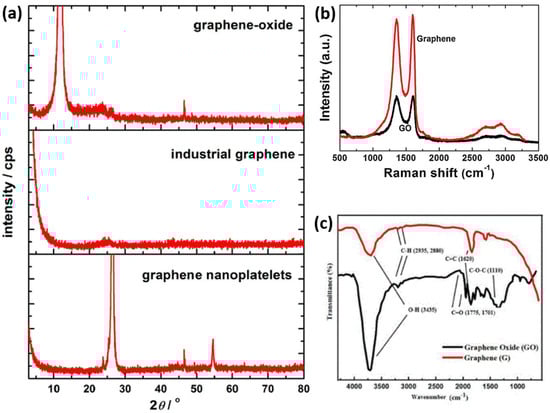 (a) XRD spectra of the graphene oxide (GO), industrial graphene, and graphene nanoplatelets. Reproduced with permission from Ref. [47]. Copyright (2016) Elsevier. (b) Raman vibrational spectra of the graphene and GO. Reproduced with permission from Ref. [48]. Copyright (2014) Elsevier. (c) FTIR spectra of the graphene and GO. Reproduced with permission from Ref. [49]. Copyright (2020) Nature Publishing Group.