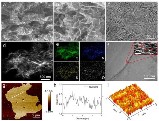 Morphological and structural characterization of nanowrinkle-enriched nitrogen and sulfur co-doped graphene (NW-NSG). (a,b) SEM images showing uniformly distributed MPP polymer coatings and contraction-induced nanoscale wrinkles on graphene sheets, (c) TEM image highlighting the furry-like MPP coating on graphene, (d) HAADF-STEM image and (e) corresponding EDS elemental mapping confirming homogeneous distribution of C, N, S, and O, (f) HRTEM image displaying enlarged interlayer spacing (~0.41 nm), indicative of heteroatom doping and nanowrinkling, (g) AFM topographic image and (h) its corresponding height profile, demonstrating nanoscale surface features, and (i) 3D AFM visualization revealing well-defined, sharp wrinkles across the NW-NSG surface. Reproduced with permission from Ref. [50]. Copyright (2025) American Chemical Society.