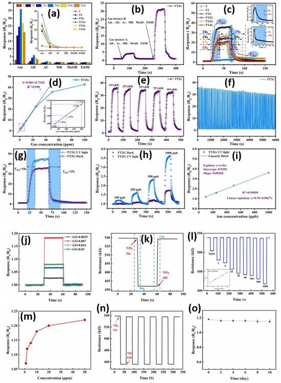 Comprehensive evaluation of the NH3 gas sensing performance of Ti3C2Tx/TiO2/graphene (TT2G) sensors. (a) Selectivity of various sensors to 50 ppm of different gases at 35% RH and 25 °C under dark conditions, showing TT2G’s strong preference for NH3. (b) Response of the TT2G sensor to a gas mixture with and without 50 ppm NH3. (c) Dynamic response and recovery behavior of different composites at 50 ppm NH3. (d) Sensitivity of TT2G to NH3 concentrations ranging from 1 to 100 ppm, with good linearity at low concentrations. (e) Influence of relative humidity (15–95% RH) on the response to 50 ppm NH3, demonstrating excellent humidity tolerance. (f) Repeatability and stability assessment of the TT2G sensor over 100 sensing cycles at 50 ppm NH3. (g) Effect of UV illumination on response/recovery behavior for 50 ppm NH3, showing enhanced performance. (h) Real-time response of the TT2G sensor to sub-ppm NH3 levels (100–1000 ppb) under UV light. (i) Linear fit of sensor response versus NH3 concentration under UV illumination, indicating a detection limit of 22.23 ppb. Reproduced with permission from Ref. [74]. Copyright (2024) Elsevier. (j–o) Gas sensing performance of the SiO2/GO/PVA hydrogel sensor toward NH3 at 25 °C. (j) Response to 10 ppm NH3 as a function of GO content, showing optimal performance at 0.007 mg/mL GO concentration. (k) Transient response and recovery behavior of the sensor toward 10 ppm NH3, exhibiting rapid kinetics with response and recovery times of 10 s and 12 s, respectively. (l) Dynamic response curves of the sensor to NH3 concentrations ranging from 1 to 1000 ppm. (m) Relationship between sensor response and NH3 concentration, illustrating saturation behavior at higher concentrations. (n) Repeatability test over five exposure cycles to 10 ppm NH3, confirming high reproducibility. (o) Long-term stability assessment of the sensor response to 10 ppm NH3 over 15 days, demonstrating excellent durability and consistency. Reproduced with permission from Ref. [75]. Copyright (2025) Elsevier.