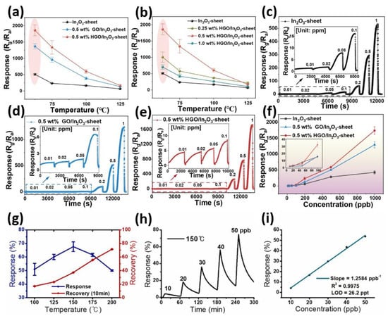 Gas-sensing performance of holey graphene oxide (HGO)/In2O3-based sensors. (a) Responses to 1 ppm NO2 for In2O3-sheet, GO/In2O3-sheet, and HGO/In2O3-sheet sensors, depending on temperature, (b) Effect of HGO loading on sensor response at 62.5 °C, (c–e) Dynamic response and recovery curves for various NO2 concentrations, (f) Response compared to NO2 concentration, demonstrating detection ability down to 10 ppb. Reproduced with permission from Ref. [100]. Copyright (2024) American Chemical Society. (g) Temperature-dependent response and recovery behavior of the rGO/SnO2 sensor to 100 ppb of NO2 under dry conditions, (h) dynamic response curves of the rGO/SnO2 sensor to varying NO2 concentrations (10–50 ppb) at 150 °C, (i) corresponding calibration curve showing a linear sensor response and a calculated LOD. Reproduced with permission from Ref. [101]. Copyright (2025) Elsevier.