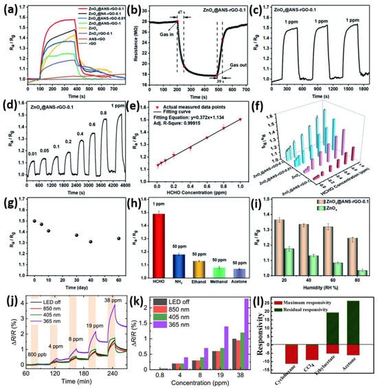 The detection of gases using ZnOx@ANS-rGO nanocomposites occurs under visible light at a 405 nm wavelength at room temperature. (a) The curves demonstrate the response of various sensing materials upon exposure to 1 ppm HCHO, (b) The ZnOx@ANS-rGO-0.1 illustrates the response and recovery times of HCHO, (c) The repeatable performance of the ZnOx@ANS-rGO-0.1 at 1 ppm HCHO, (d) Response plots of ZnOx@ANS-rGO-0.1 below 1 ppm HCHO, (e) A linear curve indicates the response of ZnOx@ANS-rGO-0.1 to varying concentrations of HCHO, (f) A comparison of measured values from different sensors with varying HCHO concentrations, (g) Stability for 1 ppm HCHO during 60 days, (h) Selectivity against various interfering gases at a fixed 50 ppm for all gases, and (i). Relative humidity levels ranging from 20% to 80% influence the sensor’s response for 0.5 ppm HCHO. Reproduced with permission from Ref. [114]. Copyright (2021) The Royal Society of Chemistry. GFET sensor response to varying concentrations of DMMP under different light wavelengths. (j) Real-time resistance changes under 365 nm (UV), 405 nm (near-UV), and 850 nm (IR) illumination, and (k) quantifies peak-to-peak relative resistance changes, highlighting enhanced sensitivity under UV due to photo-induced electronic modulation. Reproduced with permission from Ref. [115]. Copyright (2021) American Chemical Society. (l) Maximum and residual responsivities of TPU-graphene nanocomposites exposed to saturated organic vapors with varying polarities at 30 °C. Reproduced with permission from Ref. [116]. Copyright (2016) The Royal Society of Chemistry.