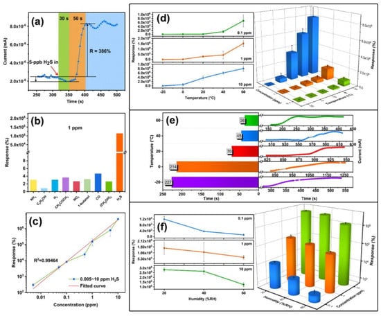 Gas-sensing performance of the Cu2O/graphene heterojunction sensor. (a) Dynamic response to 5 ppb H2S at 20 °C, (b) Selectivity toward 1 ppm H2S compared with interfering gases, (c) Response versus H2S concentration (5 ppb to 10 ppm), (d) Response at different operating temperatures (−20 °C to 60 °C), (e) Response time variation with temperature, and (f) Sensor responses under different relative humidity levels (20–60% RH). Reproduced with permission from Ref. [127]. Copyright (2025) Elsevier.
